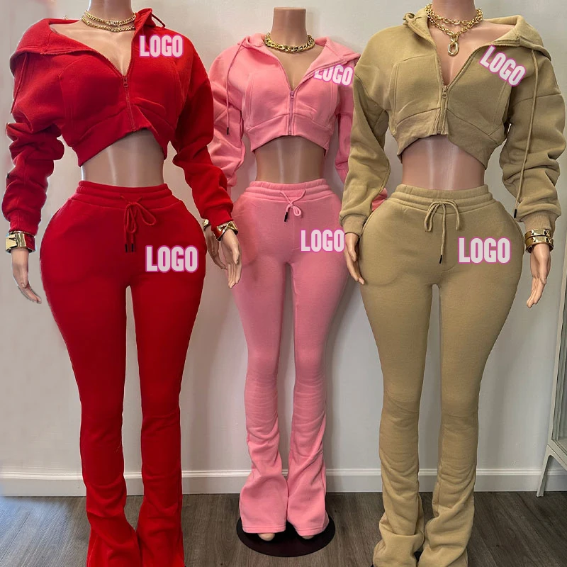 Huili Manufacturer High Quality Zip up Crop Hoodie & Slim Fit Flare Pants Custom logo Two Piece Set Clothing Women Hoodie Set
